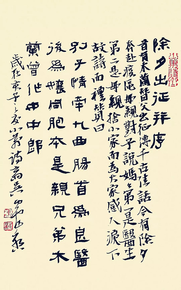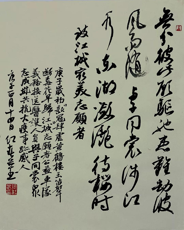 致江城最美志愿者。庚子岁初,“新冠”肆虐黄鹤楼,玉笛声断,梅花早归。江城志愿者公益车队义务接送医护人员,与子同裳,众志成城,共抗大疫,事迹感人。庚子正月十四日,红春并书。