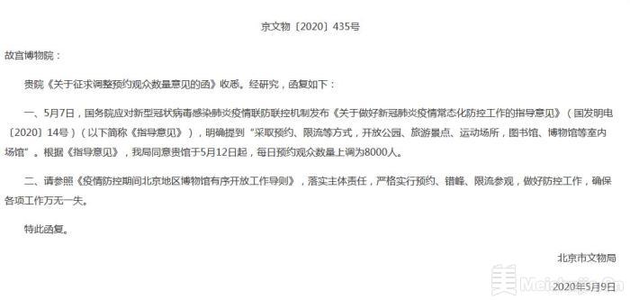 北京市文物局指出,请故宫博物院参照《疫情防控期间北京地区博物馆有序开放工作导则》,落实主体责任,严格实行预约、错峰、限流参观,做好防控工作,确保各项工作万无一失。