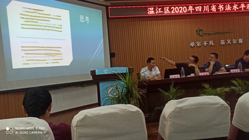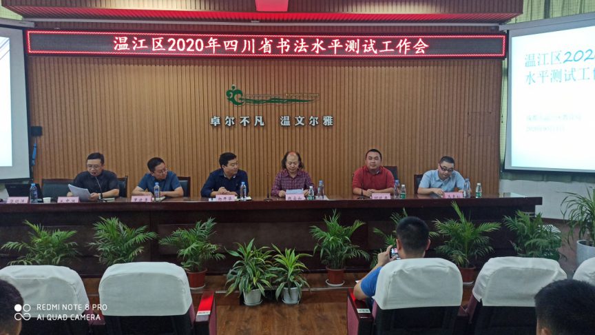 2020年9月14日下午2:30,温江区2020年四川省书法水平测试工作会在温江区实验学校卓正厅举行。三位书法专家赵安如、何晓巍、马青松莅临,教育局党组成员杨开华、温江区实验学校校长罗建勇出席。全区公民办中小学、各驻温中职院校的分管行政和工作人员参会。大会由教育局招考办综合科负责人毛中洪主持。