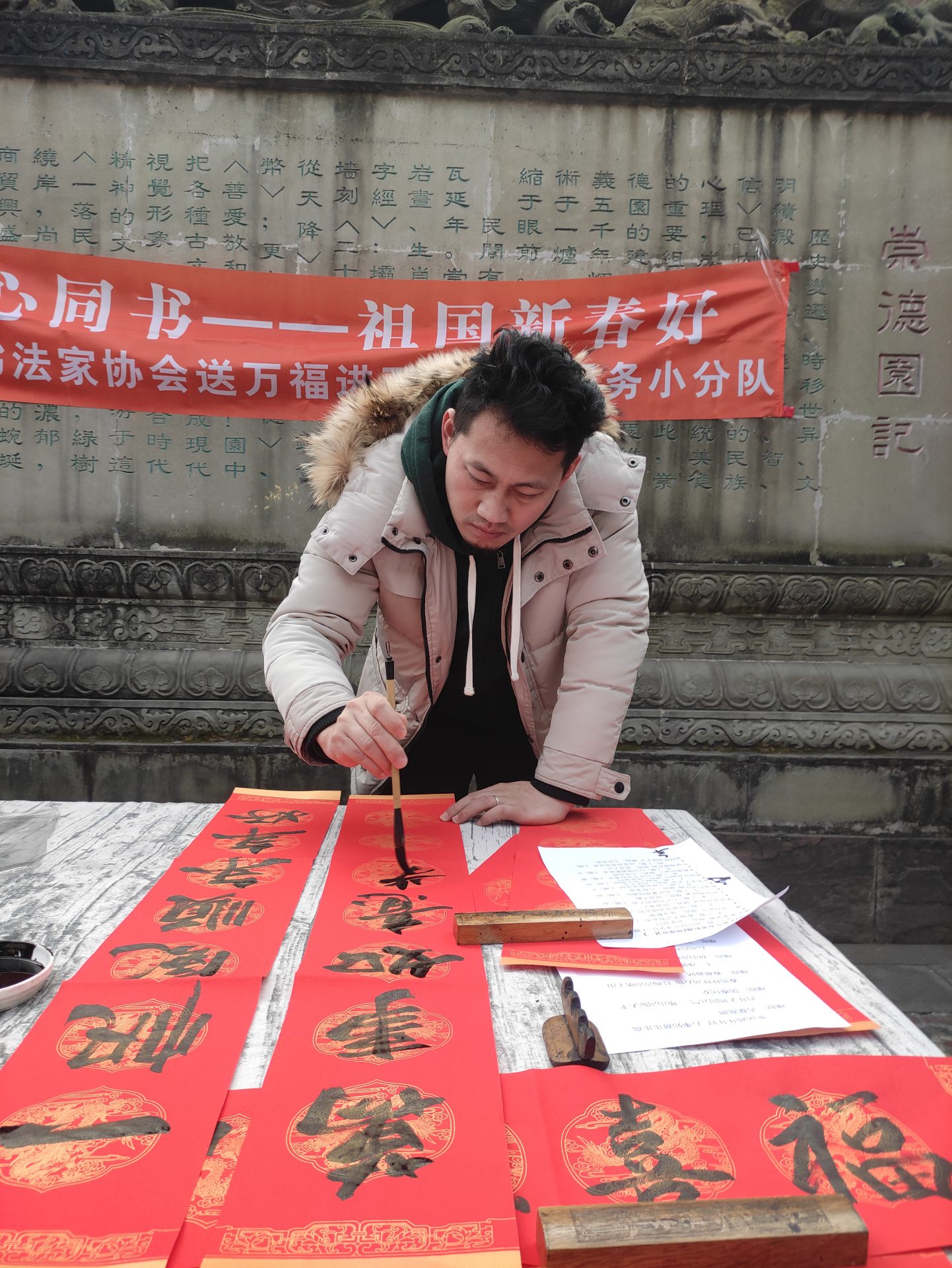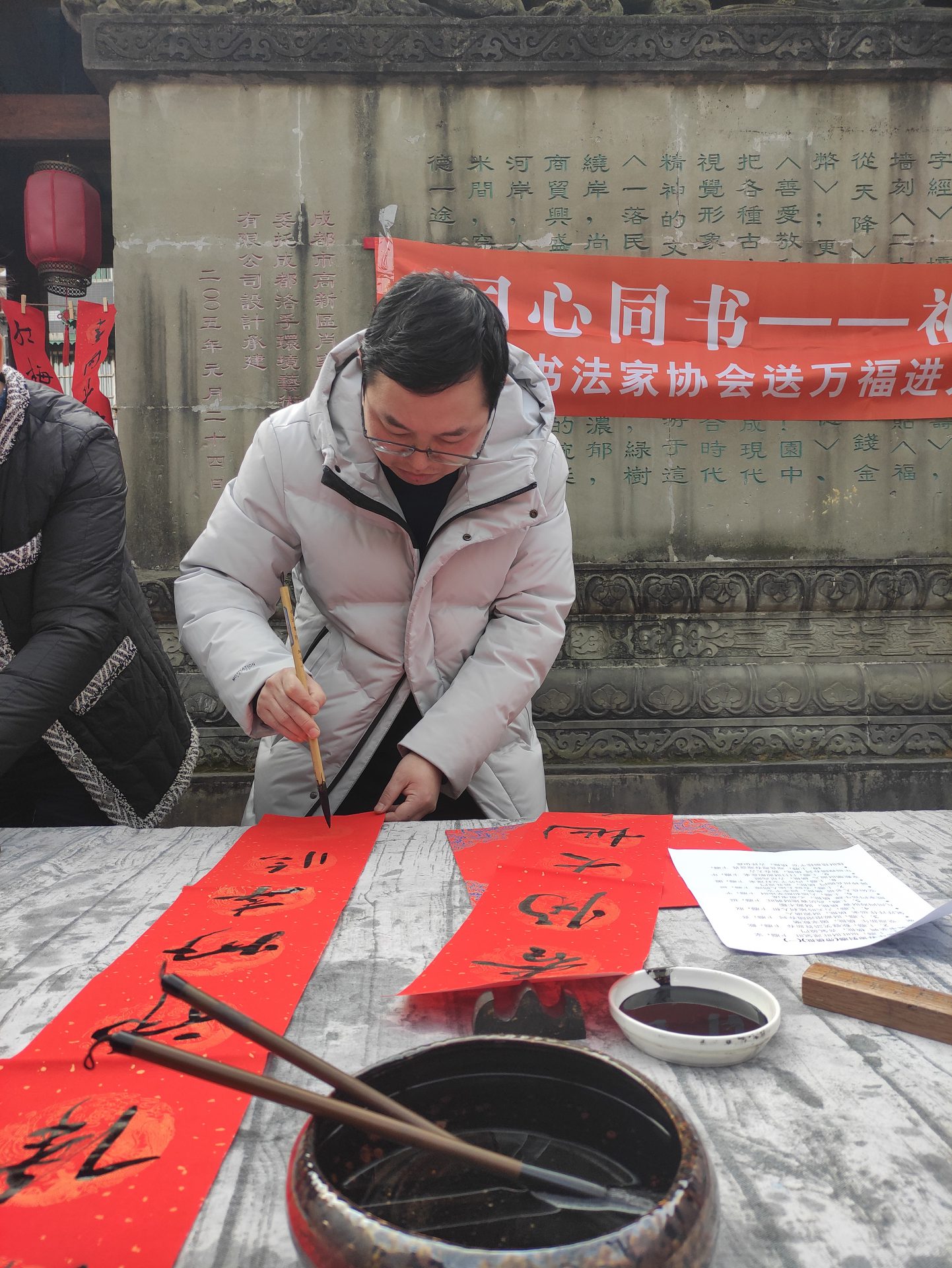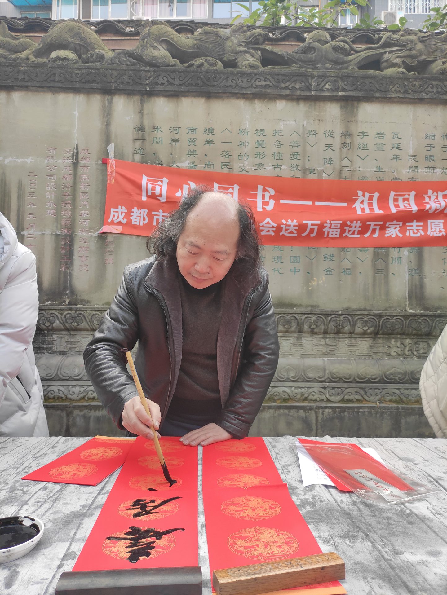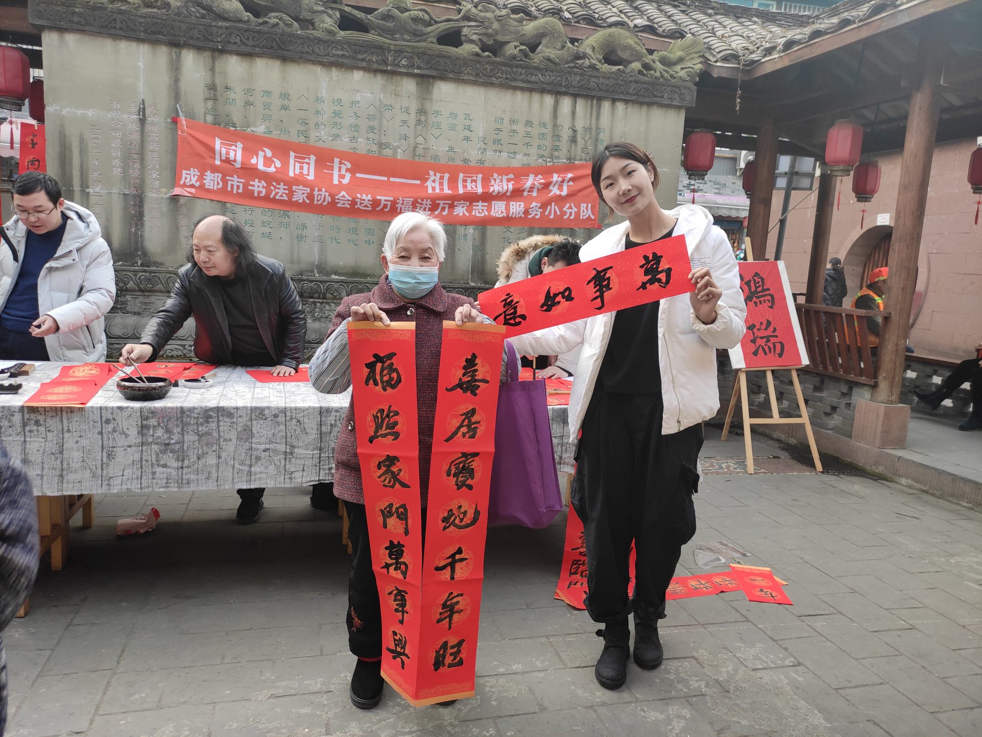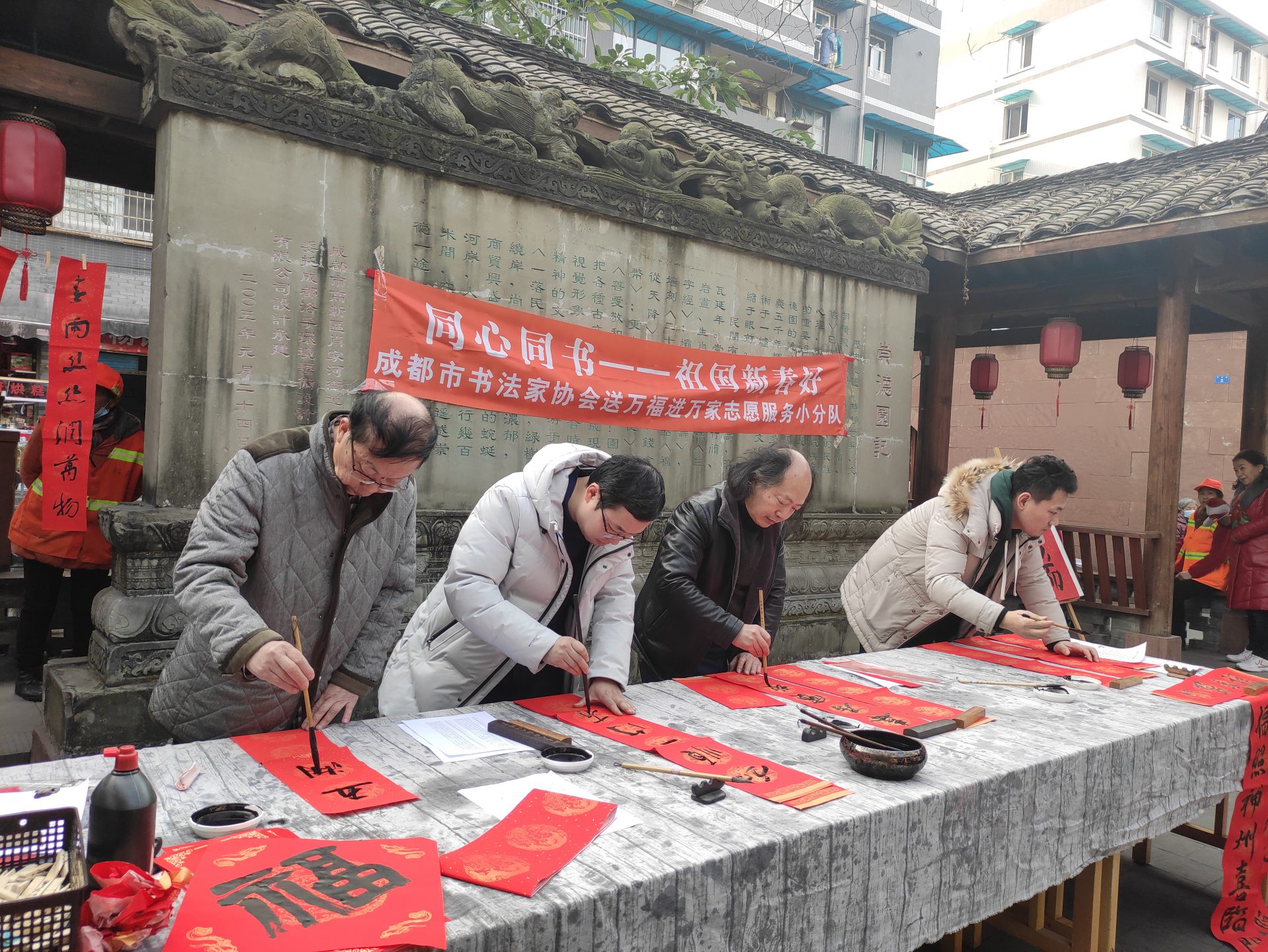 2021年1月15日下午,为深入学习贯彻成都市精神文明建设办公室《关于在2021年春节期间开展志愿服务关爱行动的通知》(成文明办发〔2021〕1号)精神,成都文艺志愿者小分队一行在成都书协常务副主席、秘书长赵安如的带领下,成都市书协党支部委员唐树良,成都市书协副秘书长王骥,办公室副主任姚正洁,秘书处成员张亚方,会员辛海涛、刘亚利等一行走进武侯区肖家河街道联谊社区开展志愿服务关爱行动,为广大人民群众写春联、送福字,带来迎接新春的喜悦心情,备受与会者好评。