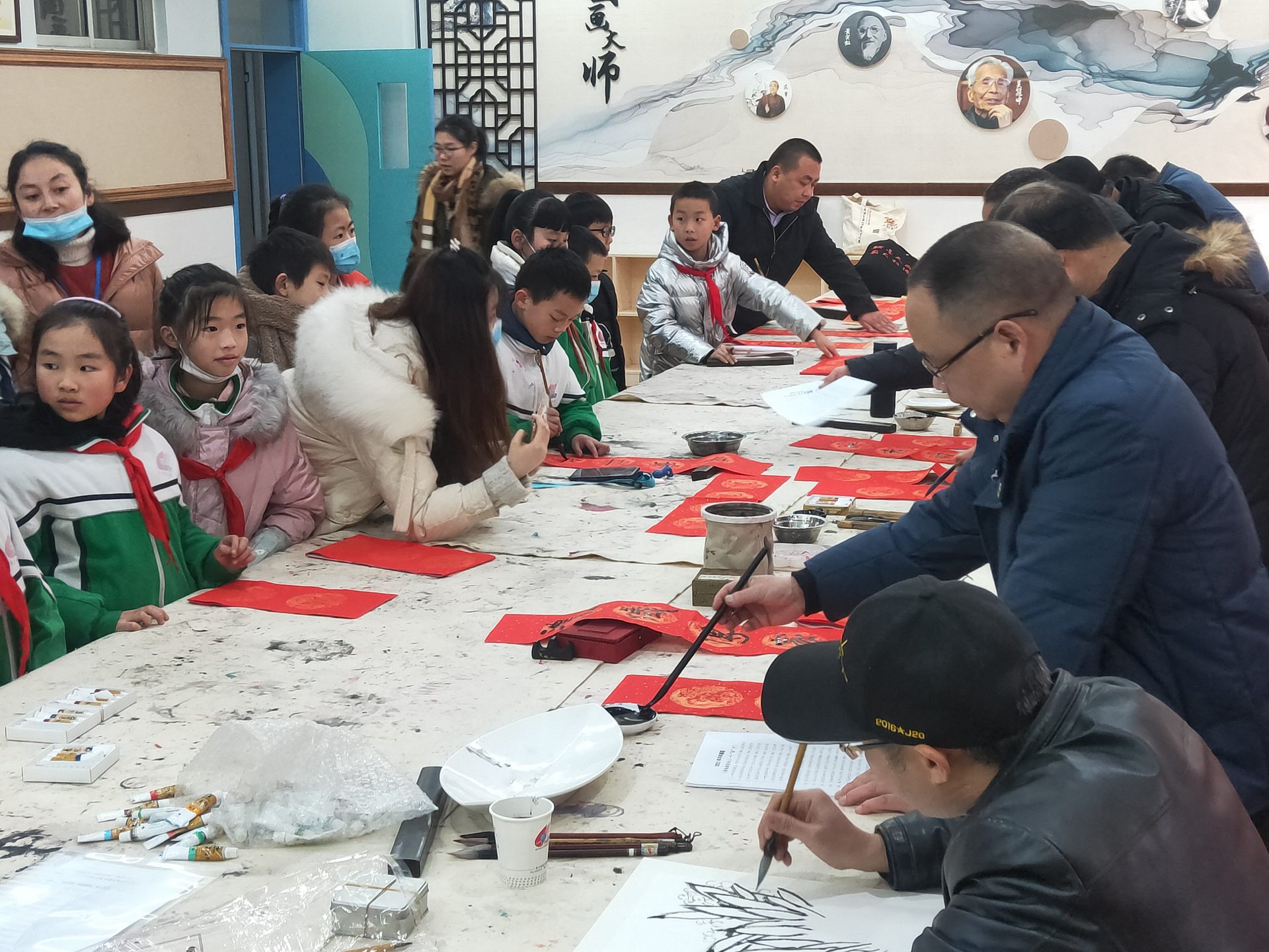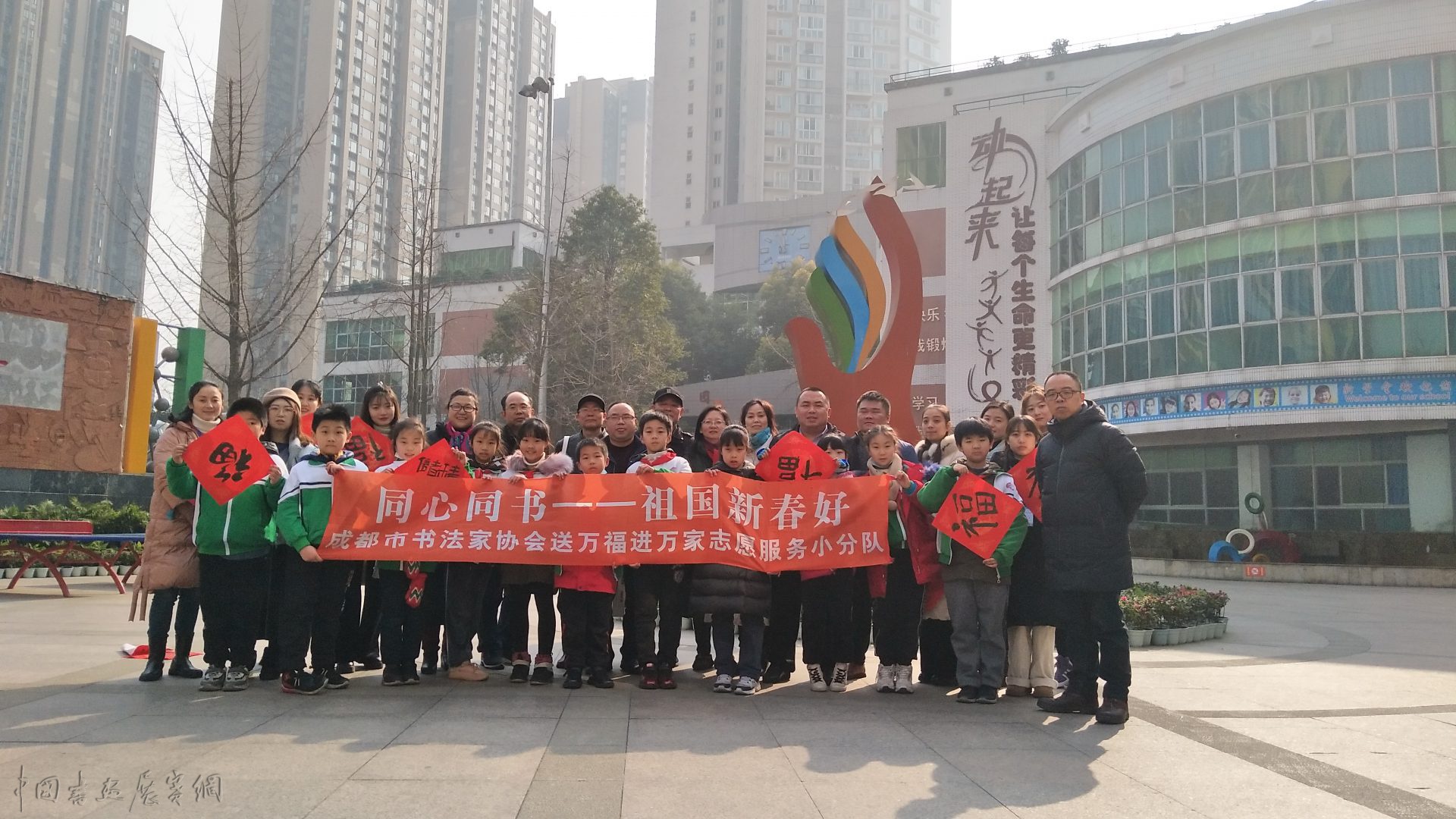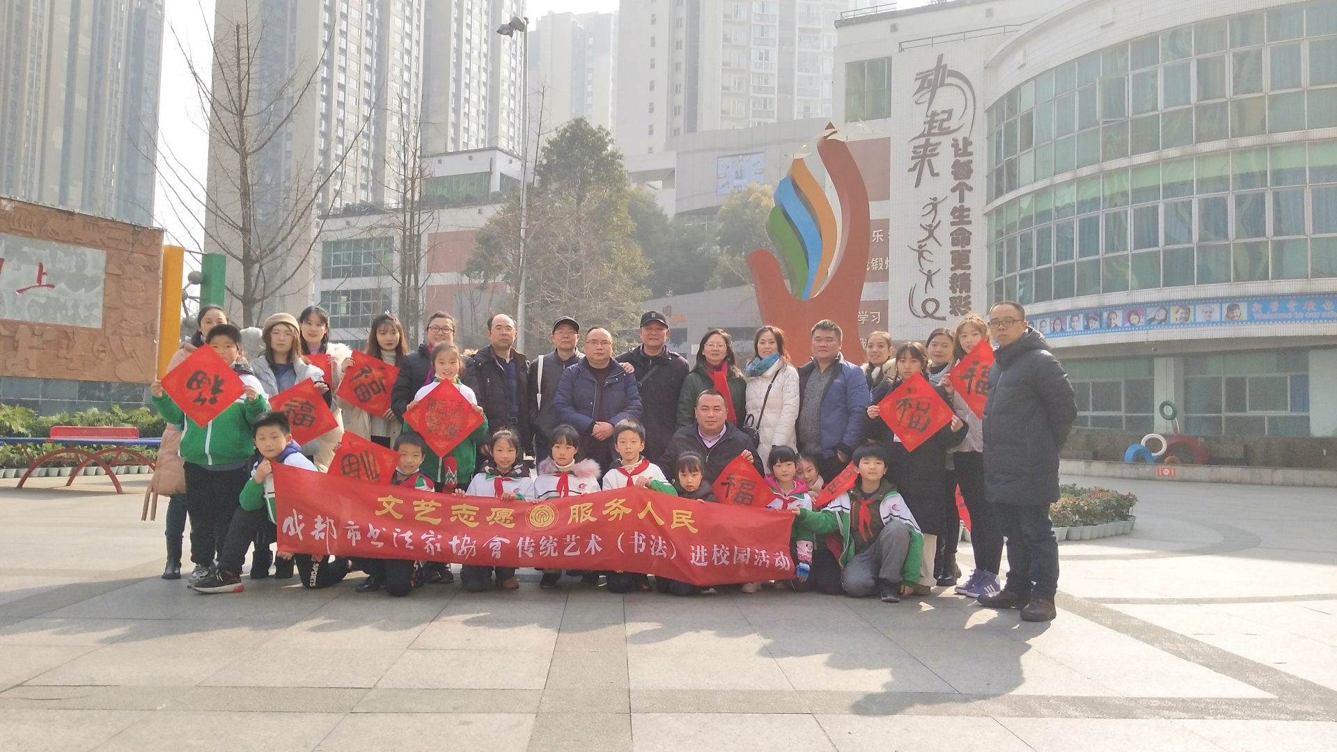 2021年1月15日上午,为深入学习贯彻成都市精神文明建设办公室《关于在2021年春节期间开展志愿服务关爱行动的通知》(成文明办发〔2021〕1号)精神,成都文艺志愿者小分队一行在中共成都市文联成都市书协支部书记何晓巍的带领下,成都市书协副秘书长柳声扬,成都市书协理事杨书虎,成都市书协办公室副主任姚正洁,会员余政、龚斌、程星琰等一行走进电子科技大学附属实验小学开展志愿服务关爱行动。艺术家们一行,为广大师生写春联、送福字,备受好评。