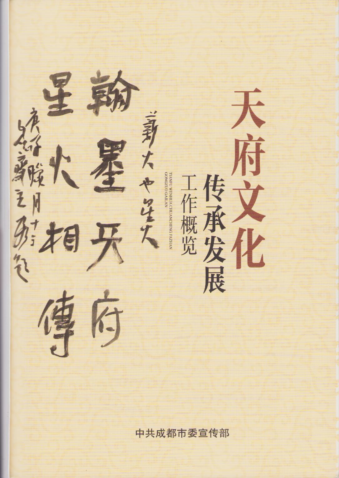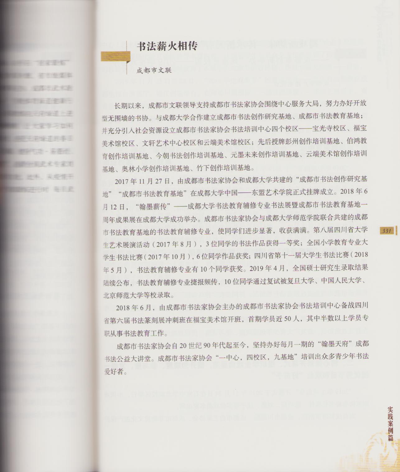 2020年12月,经成都市文联推荐,中共成都市委宣传部将成都市书协近年来在书法传承方面的工作概况《书法薪火相传》作为天府文化传承发展工作典型实践案例编入《天府文化传承发展工作概览》。