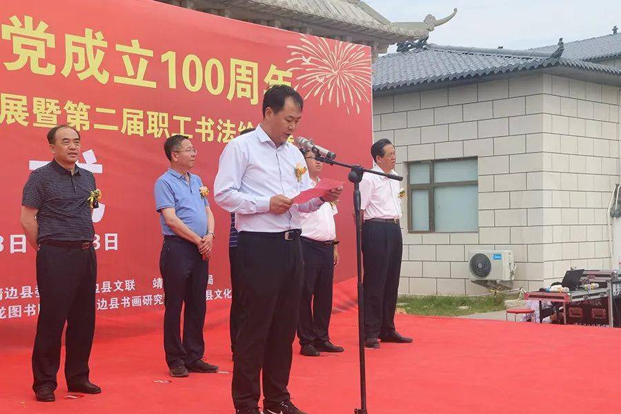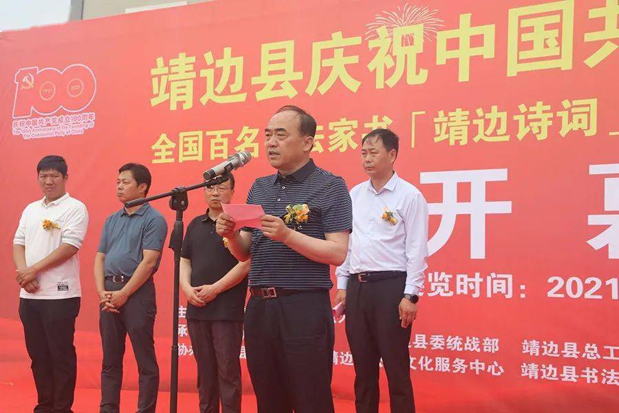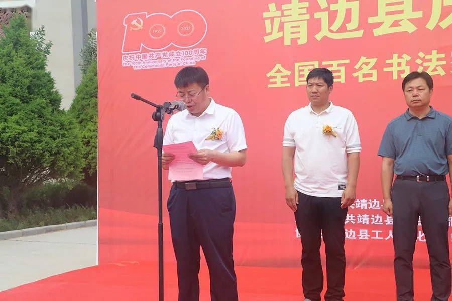 开幕式由县委常委统战部部长高正刚主持;县委常委任利戈致辞,中国书法家协会会员、靖边县龙图书院院长刘伟介绍了全国百名书法家邀请展筹备情况;全国百名书法家邀请展参展代表聂政进行了发言;县总工会援助中心主任史雪峰介绍第二届职工书画展筹备情况并宣读了获奖入展人员名单;县委常委、宣传部部长白银喜作了重要讲话;最后,县委常委、副县长刘波宣布靖边县庆祝中国共产党成立100周年全国百名书法家书“靖边诗词”邀请展暨第二届职工书法绘画展正式开幕。