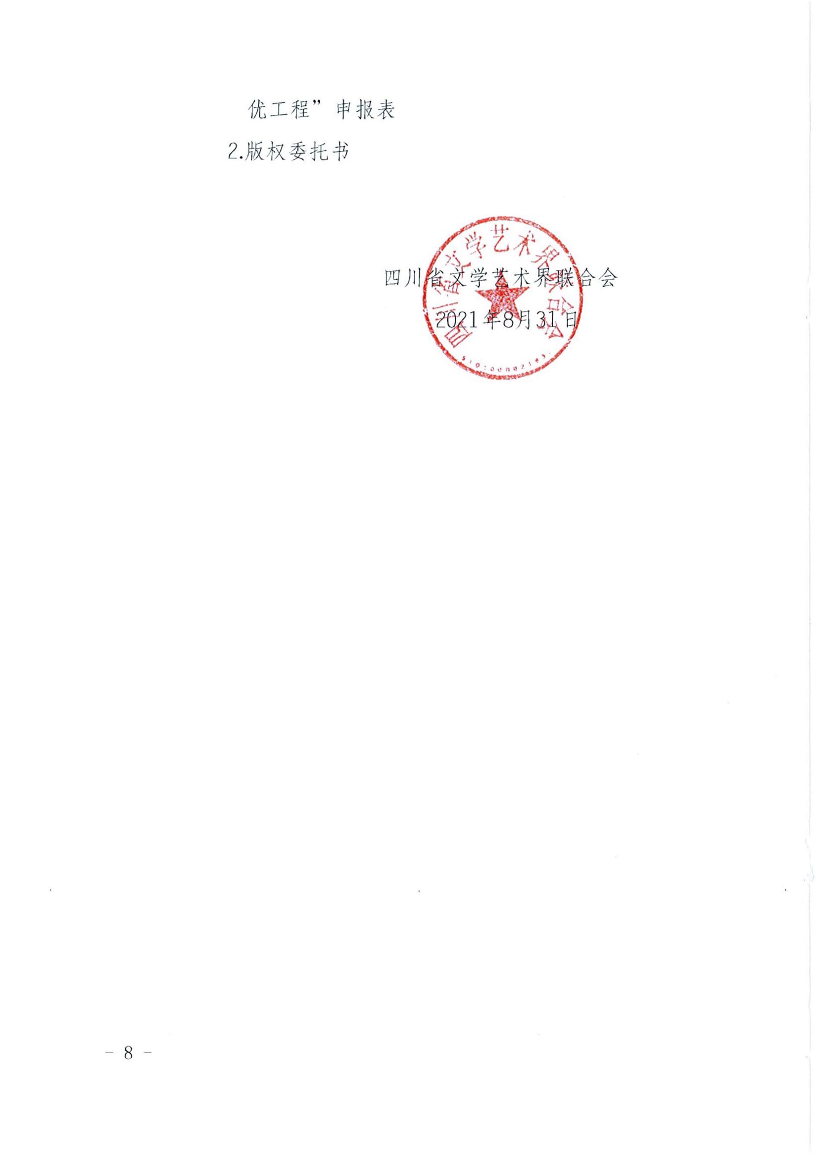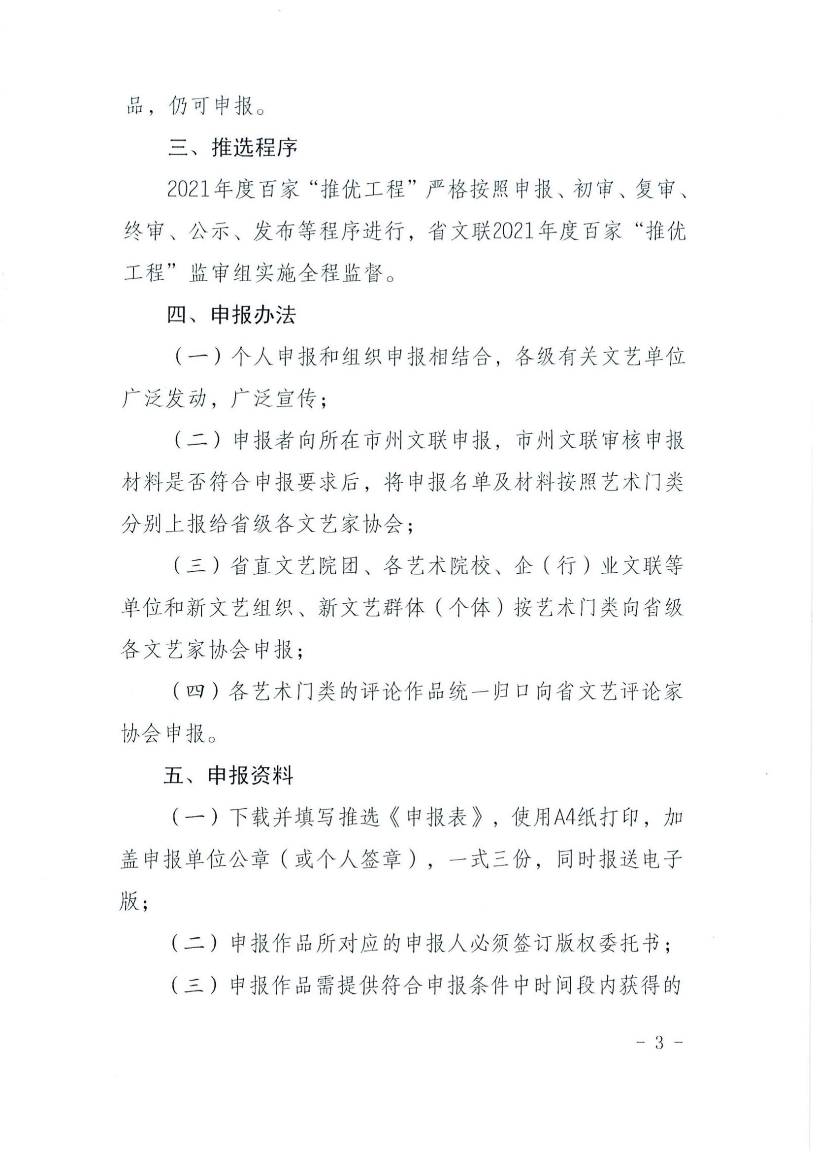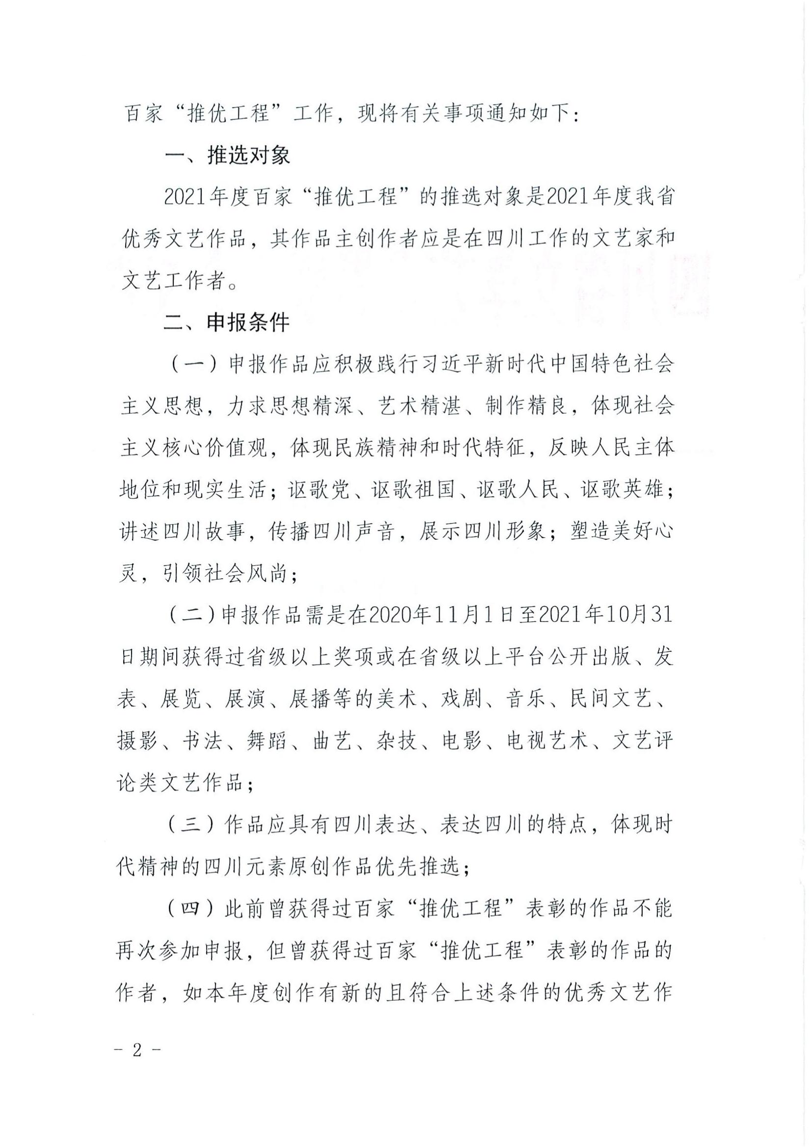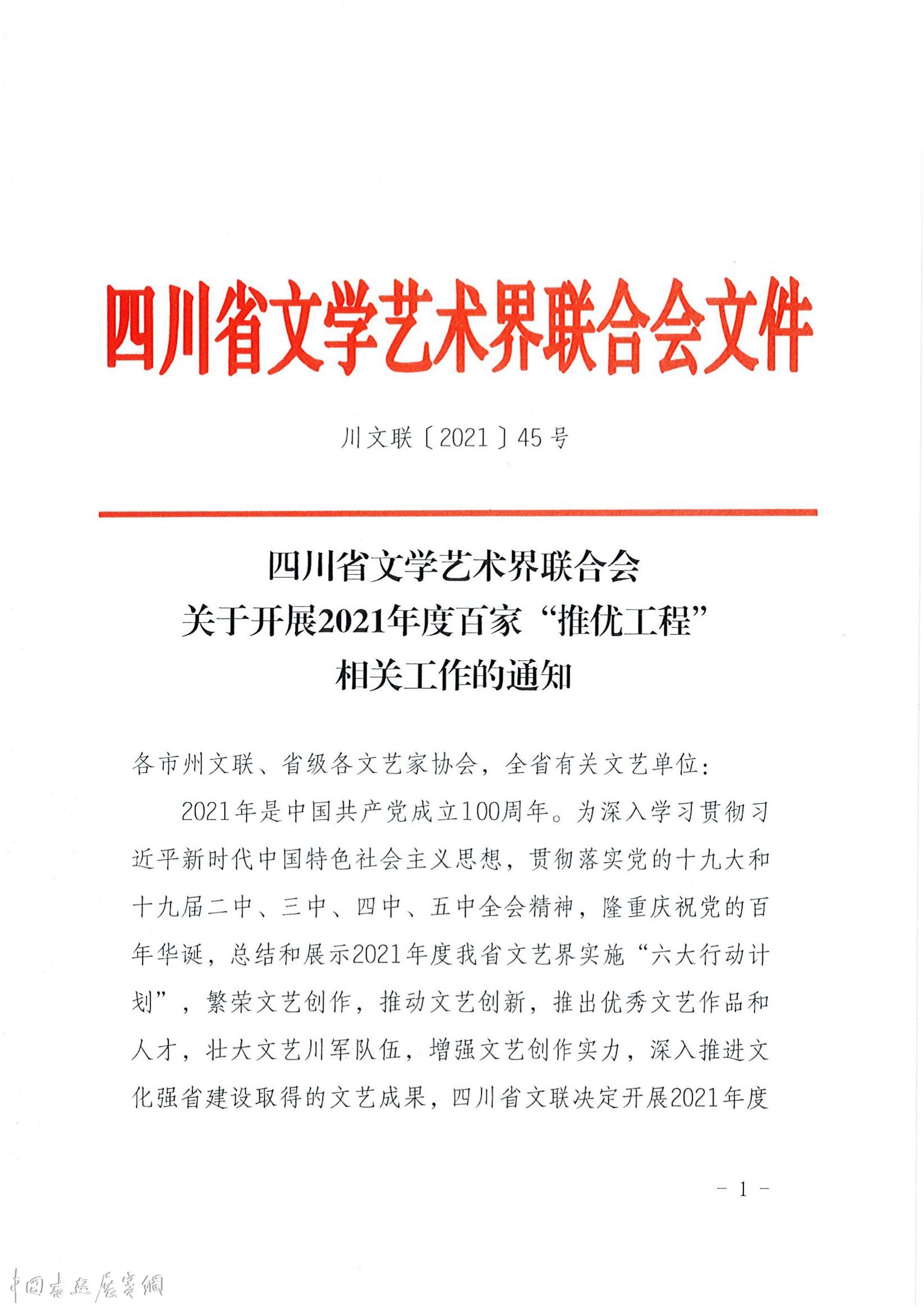 现将《四川省文学艺术界联合会关于开展2021年度百家“推优工程”相关工作的通知》(川文联〔2021〕45号)转发给你们,请高度重视此项工作,严格按照有关申报对象、申报条件、申报资料、申报要求的相关规定,积极组织本地区、本协会书法家开展申报资料整理、汇总,对申报作品、材料进行初审后,于2021年10月22日(星期五)前将纸质材料及材料电子版汇总至市书协办公室(联系人:姚正洁 联系电话:18113025034 邮箱:yzj@cdshufa.cn)。
