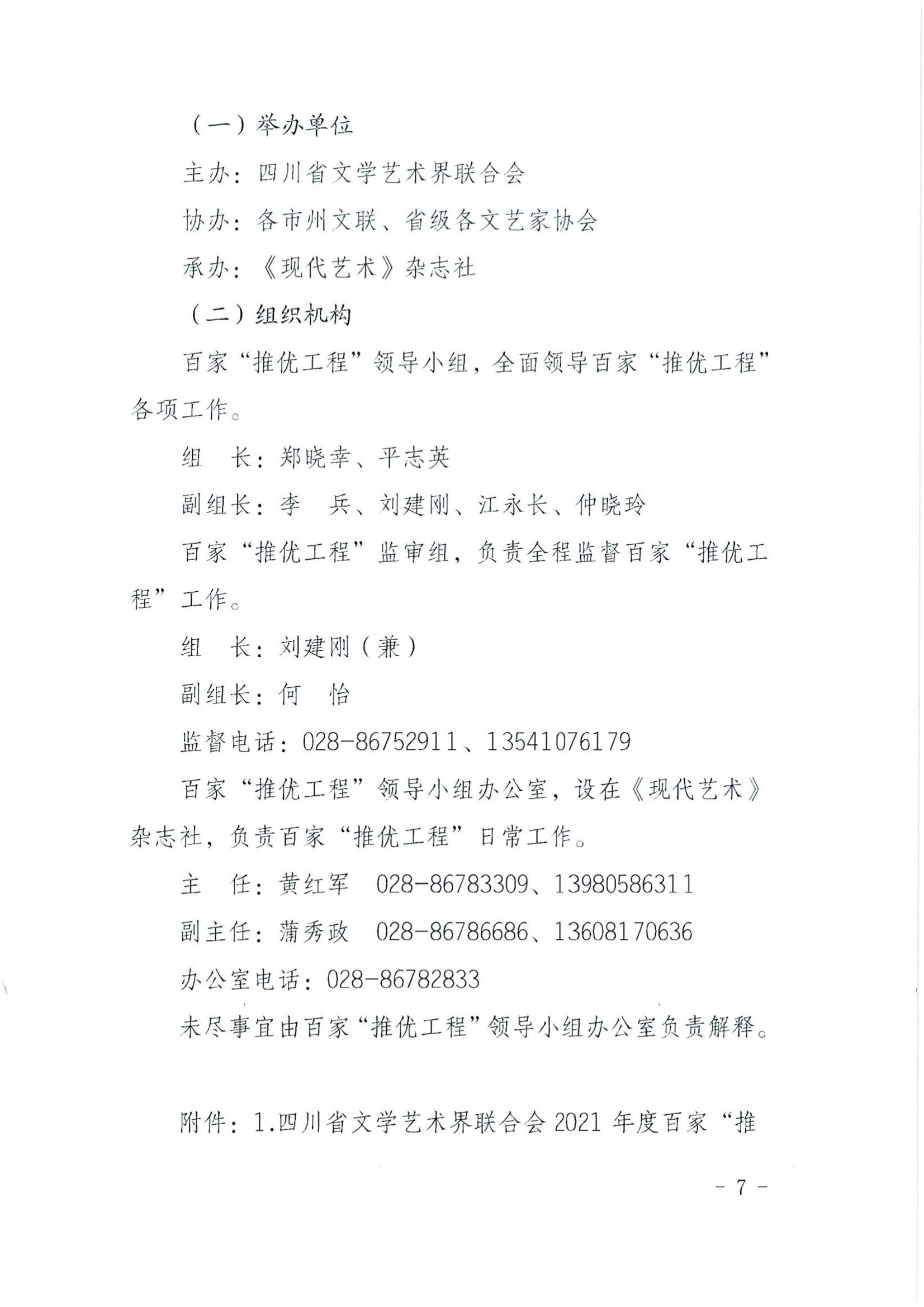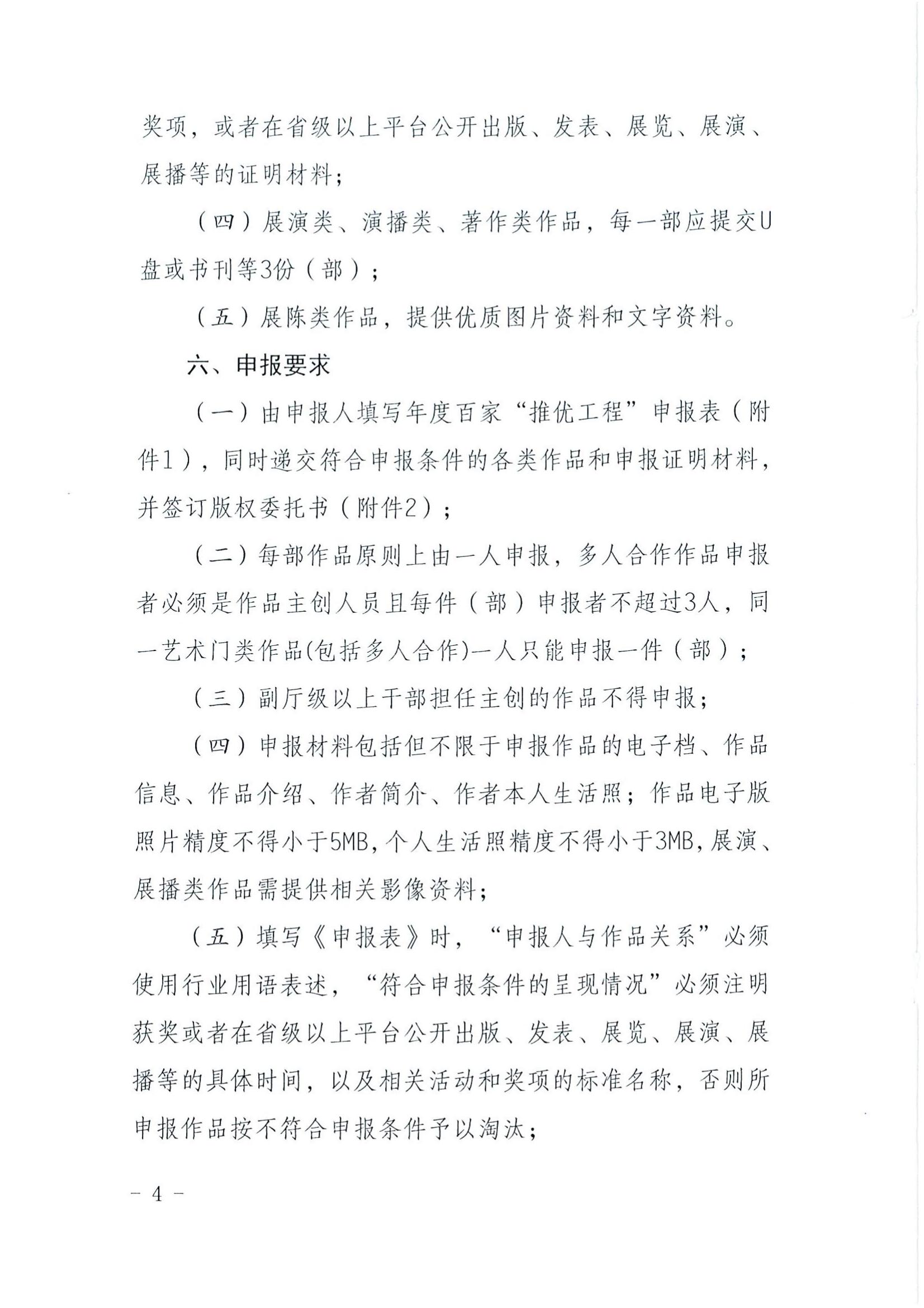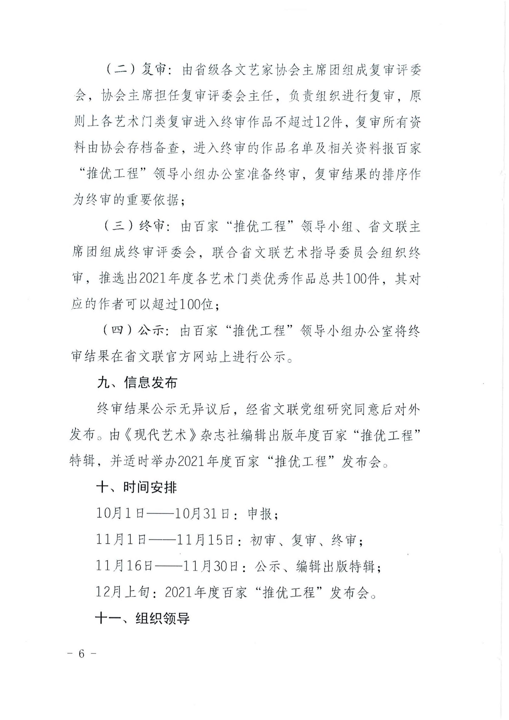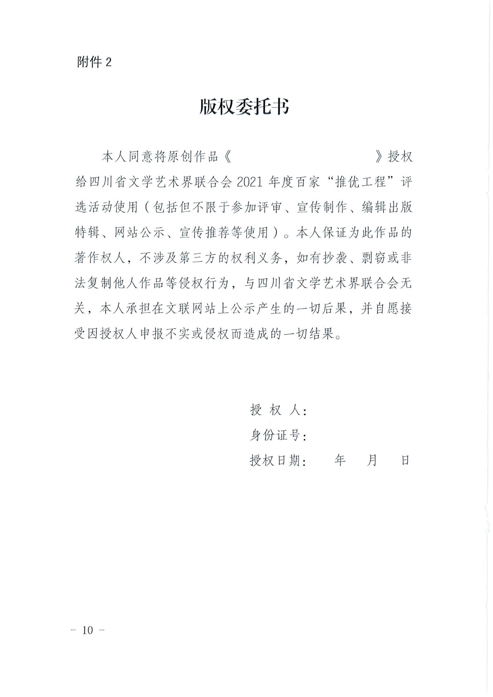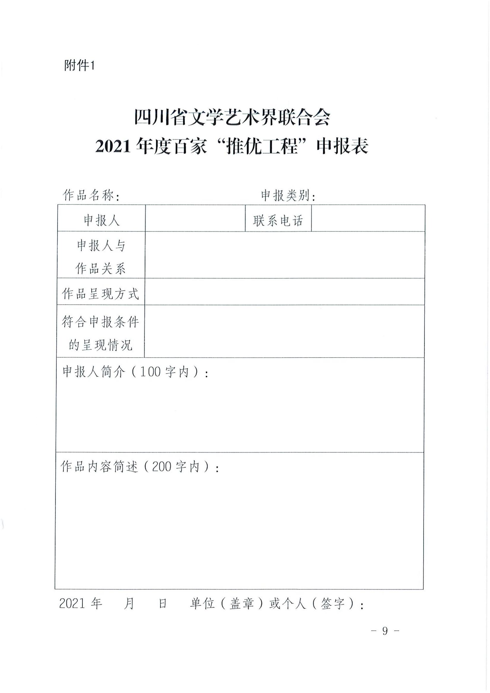 现将《四川省文学艺术界联合会关于开展2021年度百家“推优工程”相关工作的通知》(川文联〔2021〕45号)转发给你们,请高度重视此项工作,严格按照有关申报对象、申报条件、申报资料、申报要求的相关规定,积极组织本地区、本协会书法家开展申报资料整理、汇总,对申报作品、材料进行初审后,于2021年10月22日(星期五)前将纸质材料及材料电子版汇总至市书协办公室(联系人:姚正洁 联系电话:18113025034 邮箱:yzj@cdshufa.cn)。