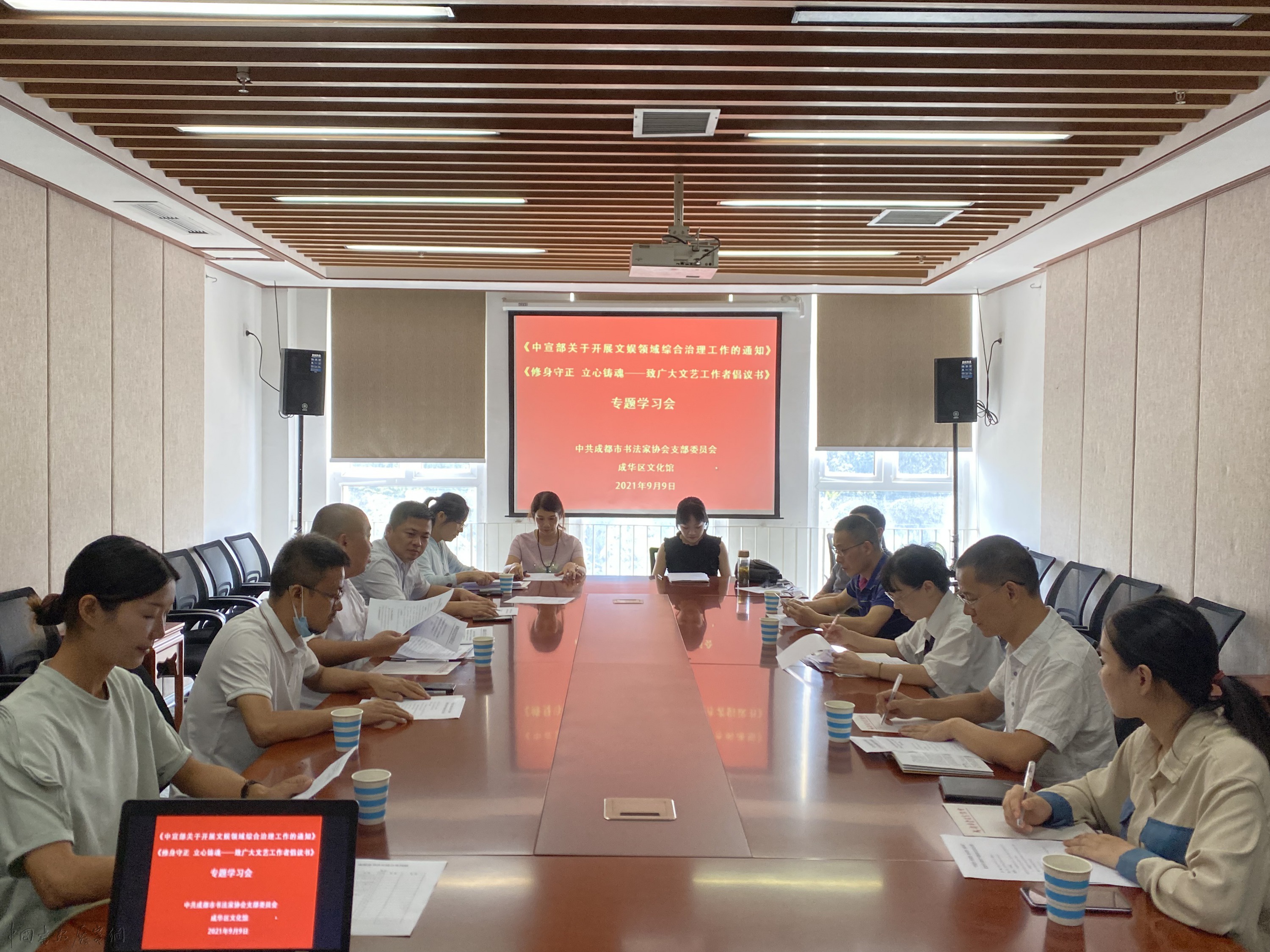2021年9月9日下午,按照市文联统一要求部署,成都市书协党支部《中宣部关于开展文娱领域 综合治理工作的通知》和《修身守正 立心铸魂——致广大文艺工作者倡议书》专题学习会在成华区文化馆召开,会议由支部书记何晓巍同志主持。