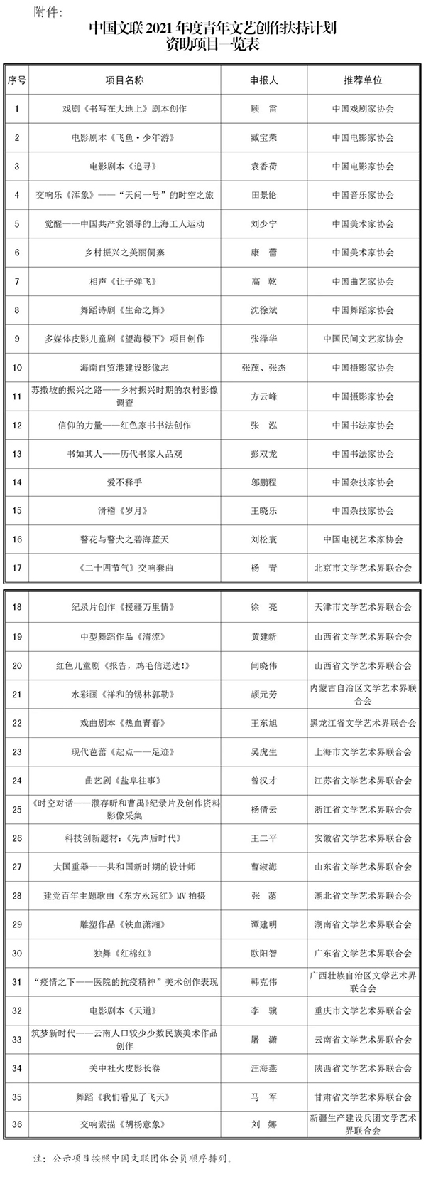 附件:中国文联2021年度青年文艺创作扶持计划资助项目一览表