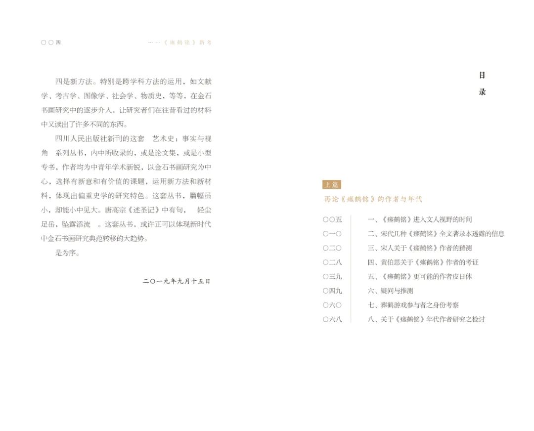 《瘗鹤铭新考》 著作 2020年本书分三大专题,分别讨论瘗鹤铭的年代与作者,瘗鹤铭书法的接受史,瘗鹤铭拓本(水前本)的情况。首次提出“瘗鹤勒铭其实是皮日休等受诗歌中‘拟作’影响,演出的一场‘拟陶弘景葬鹤游戏’”的研究结论。全面梳理瘗鹤铭发现以来的书法接受史,认为不同时代瘗鹤铭书法的接受(学习)情况,与该时代对瘗鹤铭作者的认识有关。研究瘗鹤铭传世拓本情况,对现存“水前本”的真实性提出疑问。
