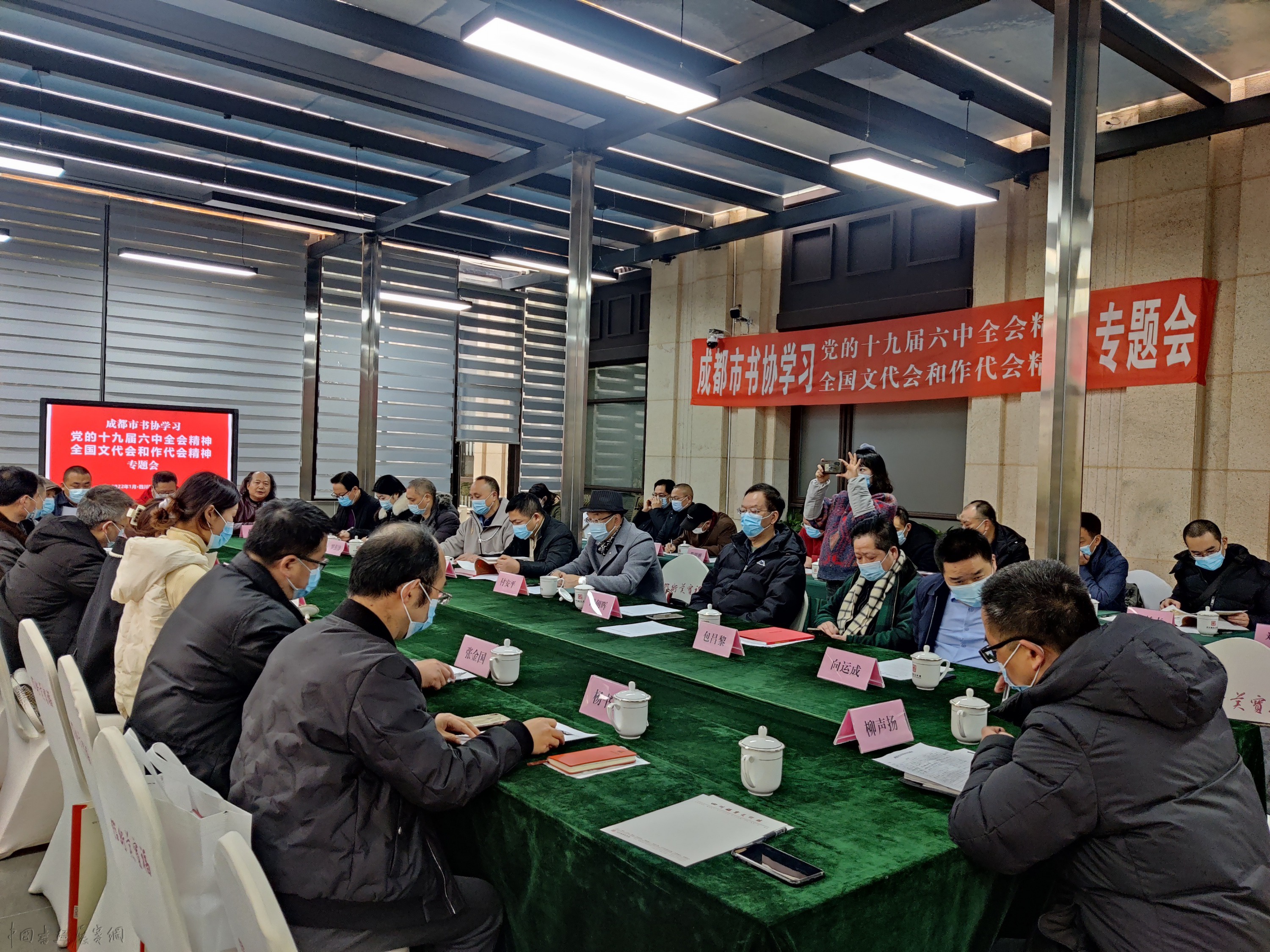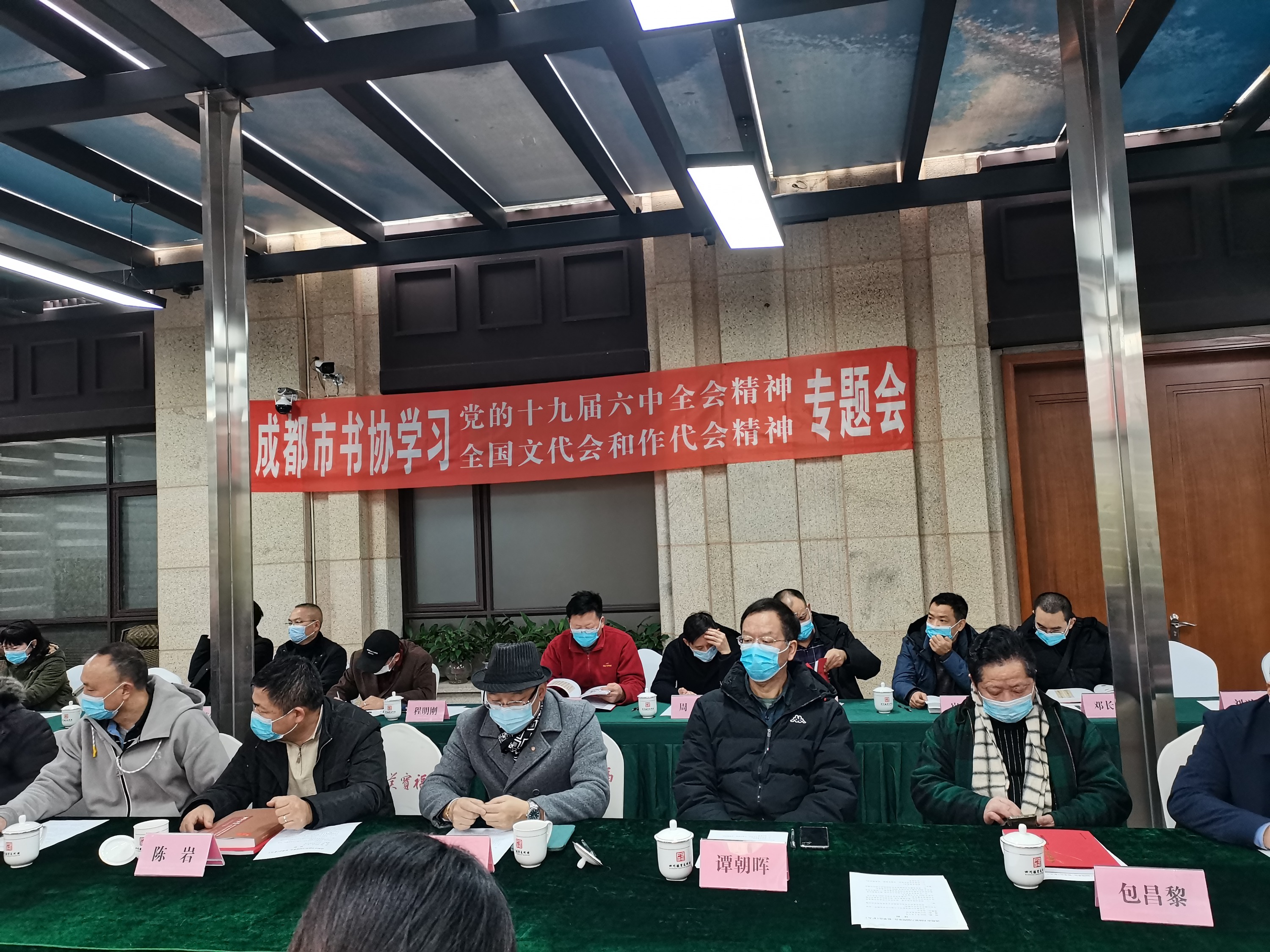 成都市书协党支部书记何晓巍领学了党的十九届六中全会精神、全国文代会和作代会精神。成都市书协副主席钟杨琴笙传达了成都市文联成都文艺界座谈会精神。