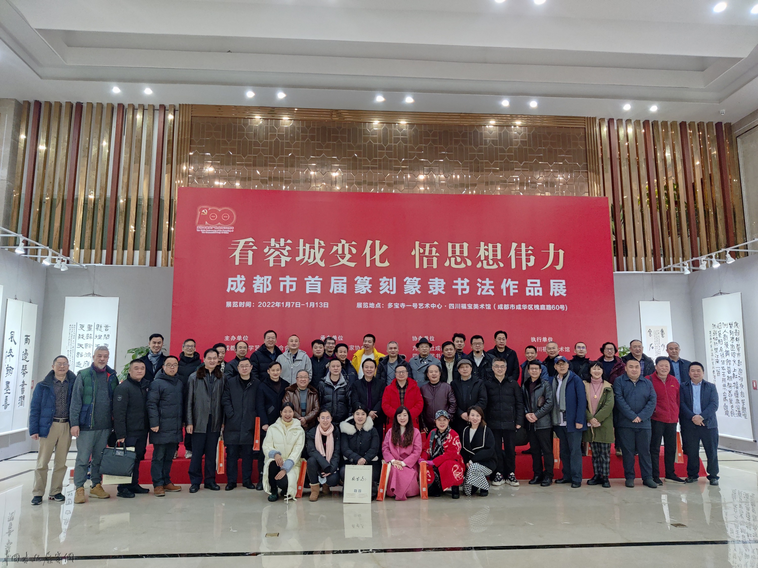 2022年1月7日,由成都市文学艺术界联合会主办,成都市书法家协会、开明印社、成都市文艺发展服务中心承办的“‘看蓉城变化 悟思想伟力’庆祝中国共产党成立100周年——成都市首届篆刻篆隶书法作品展”在四川福宝美术馆开展。受疫情影响,本次展览不举行开幕式。开展当天,中国书法家协会副主席,四川省文联副主席,四川省书法家协会主席戴跃莅临指导。成都市书法家协会主席团、党支部、理事会、监事会和新文艺群体代表,开明印社代表,获奖入展作者代表饶有兴致的观看了展览。