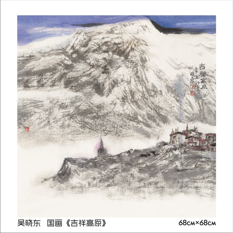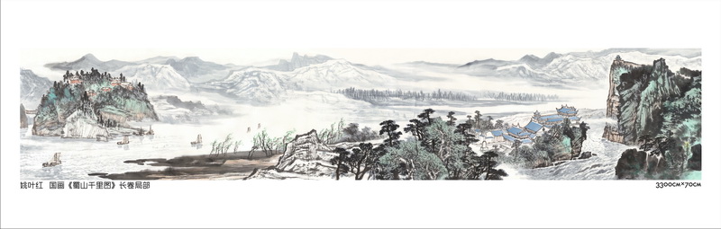 成都市文联书记杨晓阳、副秘书长唐学深观看《蜀山千里图》,成都市美协主席姚叶红、副主席陈荣、叶莹,无涯苍穹董事长刘俊辰等陪同。