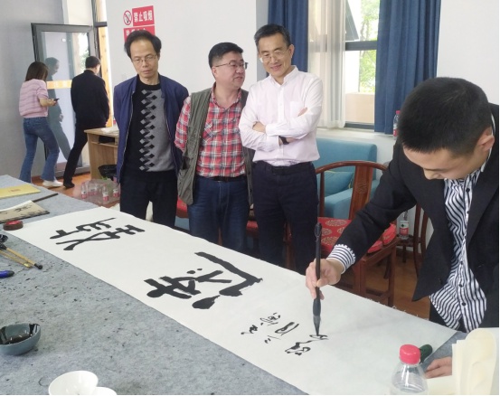 在金堂县有关领导、金堂县书法家协会主席汤文俊组织下,考察组参观了金堂县文化馆的书法展厅。在会员创作室坐谈交流。金堂县书法家协会分享了其在组织、培训、展览等方面的经验做法。汤文俊分享了个人入展《兰亭奖四十二人》的心得体会,并做了现场书写展示。