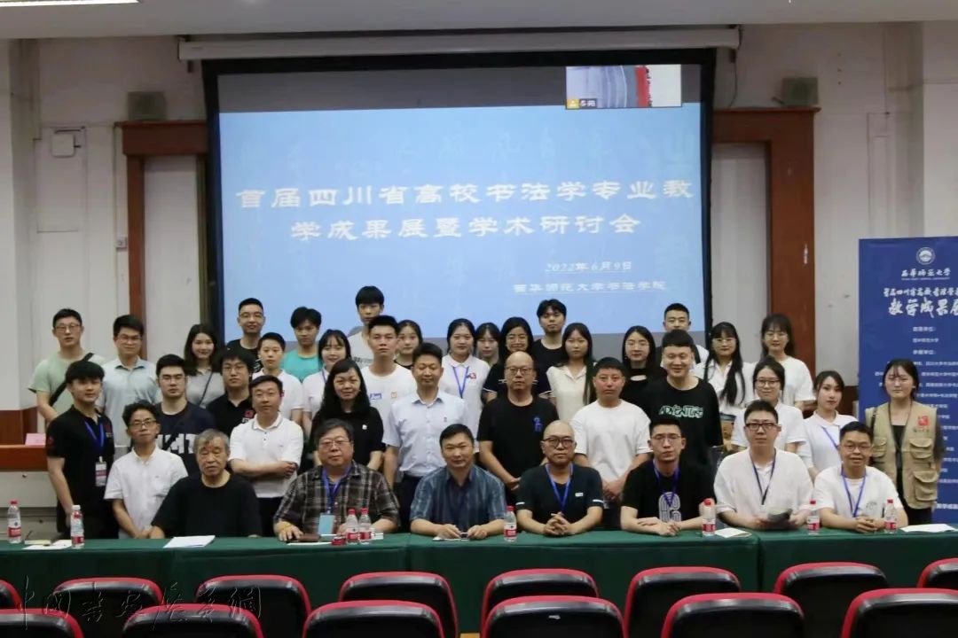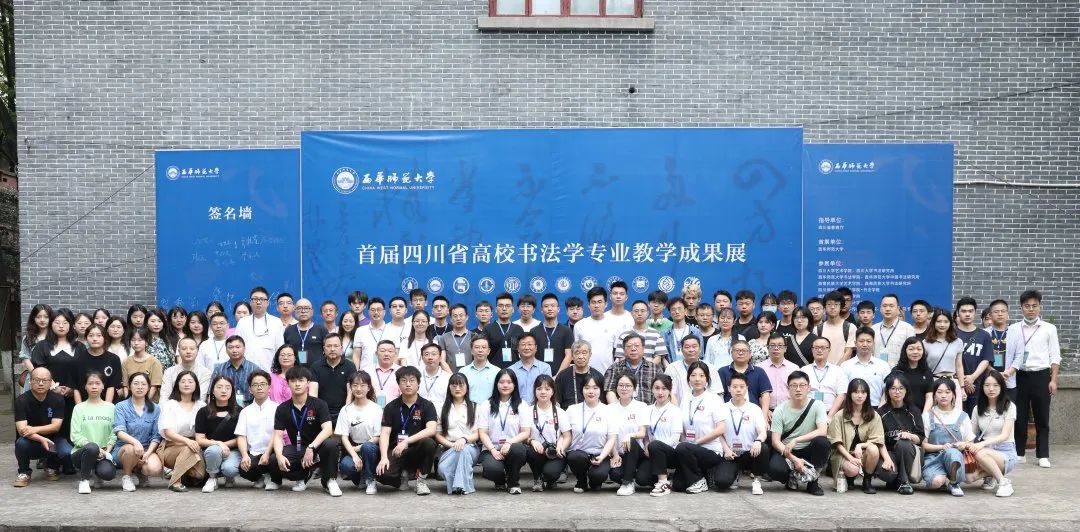 在严格落实疫情防控前提下,6月9日上午9:00,首届四川省高校书法学专业教学成果展开幕式在西华师范大学行署校区书法学院举行,12所高校参会代表集体合影留念。