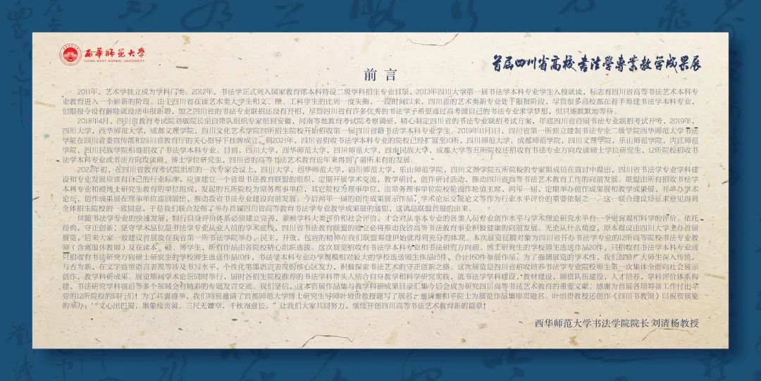这次展览是四川省招收培养书法学专业院校师生第一次集体全面向社会展示创作,教学科研成果。展览期间学术论坛同时举行,届时各招生院校推荐的书法学科带头人结合自身教学和科学研究实践,就书法学学科建设,教材建设,师资队伍建设,人才培养,学科评价体系构建,书法研究学科前沿等多个领域会有精彩的专题发言交流。我们坚信,这本首展作品集与教学科研成果目录汇集今后会成为研究四川高等书法艺术教育的重要文献。感谢为首展各项筹备工作付出辛劳的12所院校的同行们!