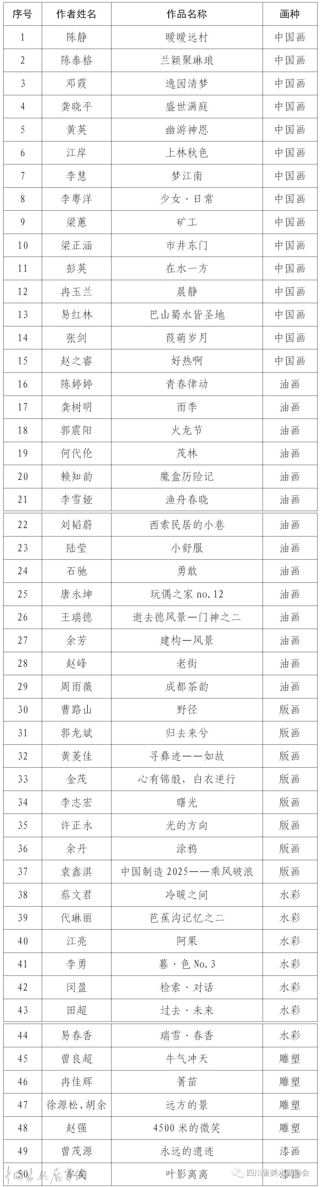 本次展览共征集到投稿作品1237件,经过四川省美术家协会、四川美术馆评委会专家初评,共有312件作品初评作品进入复评。评委们本着“公开透明、公平公正”的原则,经过严格评审,最终遴选出了入选作品182件(含优秀作品50件)。其中国画作品61件,油画作品57件,版画作品21件,水粉、水彩作品16件, 雕塑作品14件,其他画种13件。由于展陈需求,50件优秀作品将由主办方统一装裱,以呈现出本次展览的最佳面貌。