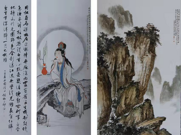 灌父先生为画,山水、人物、花鸟皆有独得,蜀中博物馆、艺术馆、及各名胜古刹之彰彰遗迹可证焉。而诸种之中,山水画又尤见胜出,上世纪50年代,尝被时任四川文联主席的音乐家常苏民公开推为“西南第一人。”其所作《峨眉九老洞天图》,典籍以“笔墨沧润,气势浑茫”概誉之,是可知其功力之深至矣 。张大千先生尝以“蜀中一支笔”目灌父,曰:“烟云烘染,人物线条,自愧不如灌父。”大赞其人物用线可以“独步川中画坛”,又赞其“金碧”之法为“今世画坛先行”。而灌父先生之花鸟画,实亦为时人之佼佼,上世纪人民大会堂之落成,邀其为绘装饰,先生以《天彭丹景图》巨幅应之,明艳壮彩,富丽堂皇。灌父先生之于书法,胎息于二王,深修于苏、米,书风雅健遒丽。其尤善擘窠,愈大而愈佳,若所题重庆“朝天门”三字,字大丈馀,却苍劲遒逸,飞宕见姿。