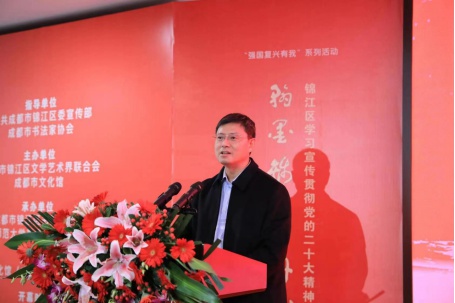 11月16日,由中共成都市锦江区委宣传部、成都市书法家协会指导,成都市锦江区文学艺术界联合会、成都市文化馆主办,锦江区书法家协会与四川师范大学美术学院·书法学院共同承办的“翰墨锦江·丹心颂党”——锦江区学习宣传贯彻党的二十大精神书法篆刻作品展在成都市文化馆隆重开幕。锦江区委副书记吴斌出席活动。