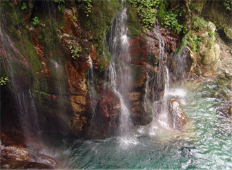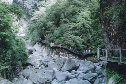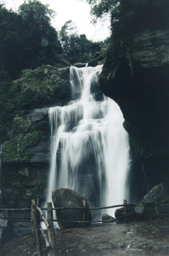 沱上,岩石壁立,危然天成,高可二十丈许。飞瀑挂壁,匹练三叠,振金嘎玉,碎浪击雪。余视其状如“川”字,戏呼为“川流不息”,同行诸友以为贴切善喻者。非余之善喻也,但在天地之妙造如斯也。乡人复告余曰;“若乃盛夏水涨之时,瀑倾如泻,砯岩转石,哮壑擂空,飚风助势、天地变色,林木震荡,生灵瑟缩,虽离瀑十数丈之遥,犹感溅珠噀面,冷风凄骨,赤日失威,心惊胆寒矣。”余观瀑侧,草木蔓发,壁萝挺秀。凉风飒飒,清芬习习,从绝壁间流下,谷迂风廻,爽气时引,使人烦襟顿洗,体适神畅,怡悦无际。下视“牛沱”,被牛首三分,俨若“品”字之形。沱水浓碧,如黛如翠,渊邃窈窅,深不可测。