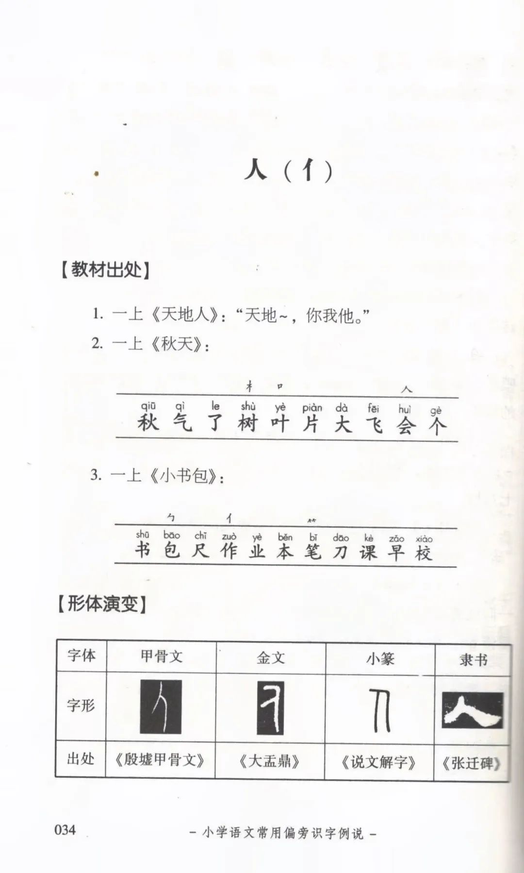本书列举汉字偏旁为教育部审定义务教育教科书(2019年版)常用偏旁64个。按本字出现及作为偏旁出现的先后次序为序,标明册数、课文,以及例句;有的本字教材上没有,则没有列举。