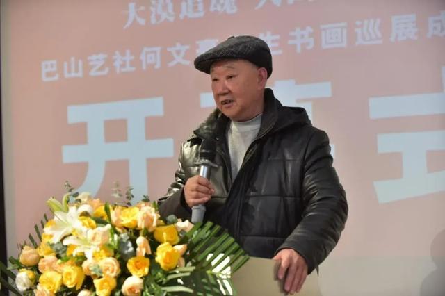 第六项、巴山艺社创始人何文豪先生致答谢辞。何文豪先生深情回顾了五十年来艺术创作的心路历程,他对大漠情怀、巴山主题创作、巴山教育精神做了深刻阐释。他感谢全体与会领导和嘉宾莅临本次画展指导交流。他同时谈了自己未来的创作计划,以及如何基于巴山画家群重要成员,为达州美术和四川美术做出自己贡献。